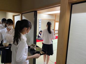 感染対策がとられたため、お運びにはお盆を使うなど、普段と少し違うところもありましたが、お茶席を体験させていただきました。3年生9名が参加し、1名はお点前を披露させていただきました。また、全員が薄茶を頂くだけでなく、にじり口からの席入りや水屋体験も行いました。