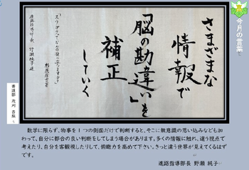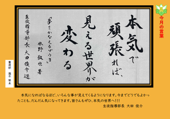 香芝高校では、時機に応じた言葉を生徒に掲示し、学校生活への意欲を高めるとともに、本への興味を喚起する。という目的で、教員が図書館の蔵書から言葉を選び、「今月の言葉」として生徒へ紹介しています。また、言葉は書道部の生徒が書いたものを掲示しています。香芝高校では、時機に応じた言葉を生徒に掲示し、学校生活への意欲を高めるとともに、本への興味を喚起する。という目的で、教員が図書館の蔵書から言葉を選び、「今月の言葉」として生徒へ紹介しています。また、言葉は書道部の生徒が書いたものを掲示しています。