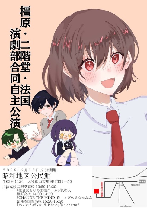 私たち橿原高校演劇部は、来る2月15日(日)、大和郡山市の昭和地区公民館において、今年度第2回目の自主公演を開催することになりました。昨夏の第1回自主公演は、本校演劇部の主催・主幹で行いましたが、今回は、前回友情出演していただいた法隆寺国際高校演劇部さんの自主公演にこちらが賛助出演させていただく形で、さらに、二階堂高校演劇部さんを加えて、3校での発表会になります。