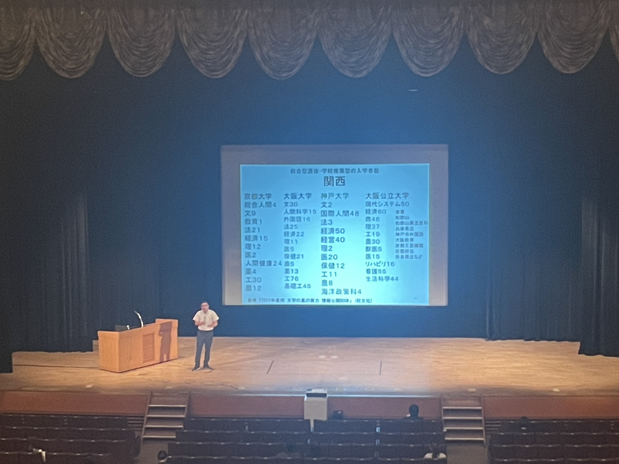 橿原市文化会館大ホールにおいて、大学イノベーション研究所所長 山内太地氏を講師に迎え、来年に控えた大学入試について解説いただきました。