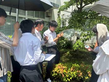 大学生から、地球温暖化の仕組みや森林の役割について講義を受けました。後半には、グループに分かれ、光合成による二酸化炭素濃度や温度・湿度への影響について、測定機器を借りて実験を行い、グラフにまとめ、考察を行いました。