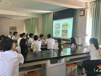 後半では、再帰反射など光の応用技術とその仕組みについて、先生の研究成果も紹介しながら丁寧にご説明いただきました。最先端の内容を交えつつも、中高生にも理解できる工夫がされており、生徒からは「もっと知りたい」「自分でも調べてみたい」といった声が多く上がりました。