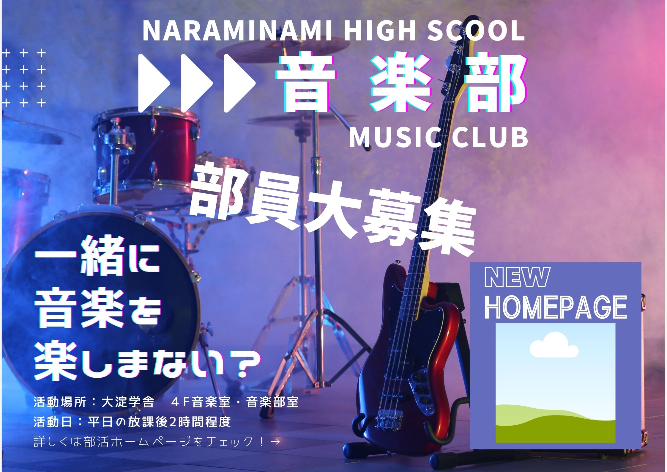 音楽部では、日々の練習を通して演奏技術の向上を目指しながら、『音楽を楽しむこと』を大切にし活動しています。校内では定期的に、放課後中庭ライブを開催しており、生徒や先生方に向けて演奏を披露しています。