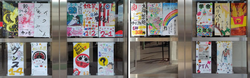 昇降口に掲示された各クラスの色とりどりのポスター。