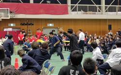 先生の笛の合図でキビキビと動き、いろんな組み体操を見せてくれました。最後は「決めポーズ」で、「ヤー」と元気いっぱいの掛け声をかけます。学舎の生徒達は、園児達の一生懸命で格好いい演技に大きな拍手を送っていました。