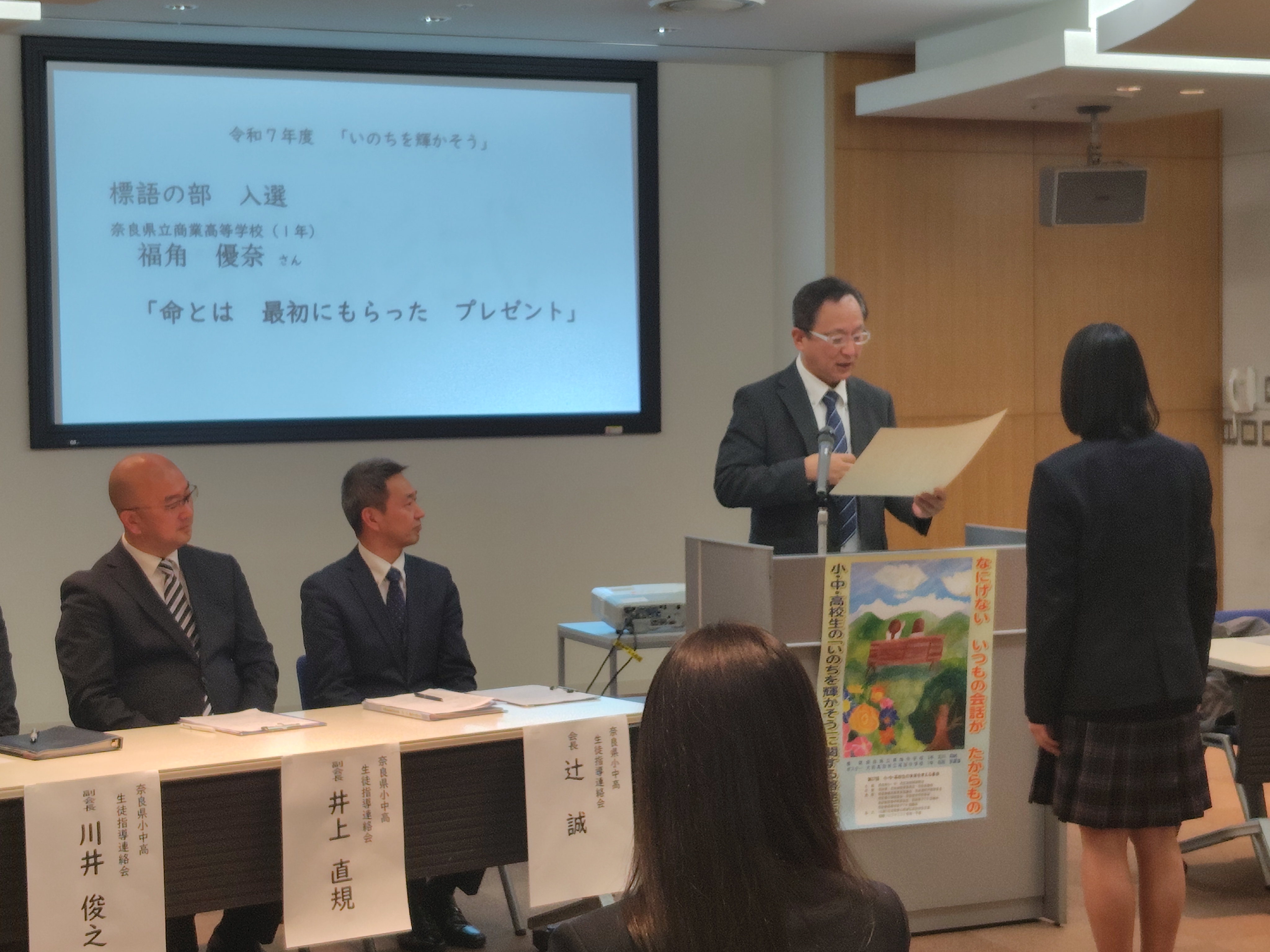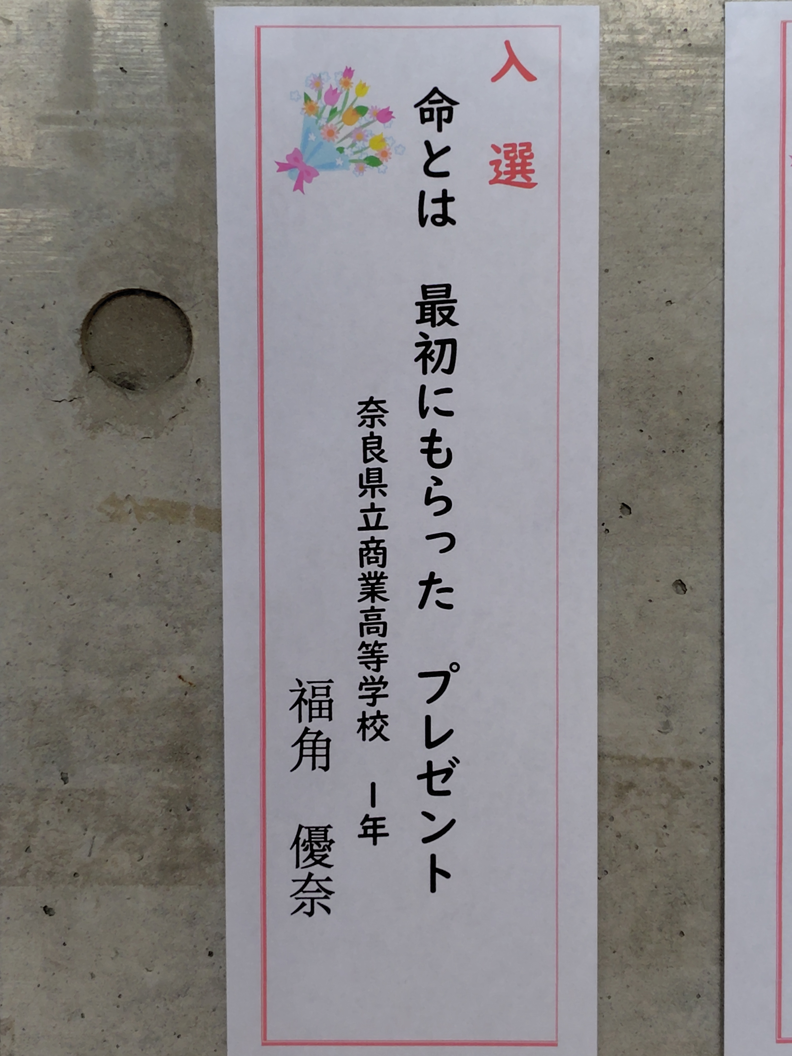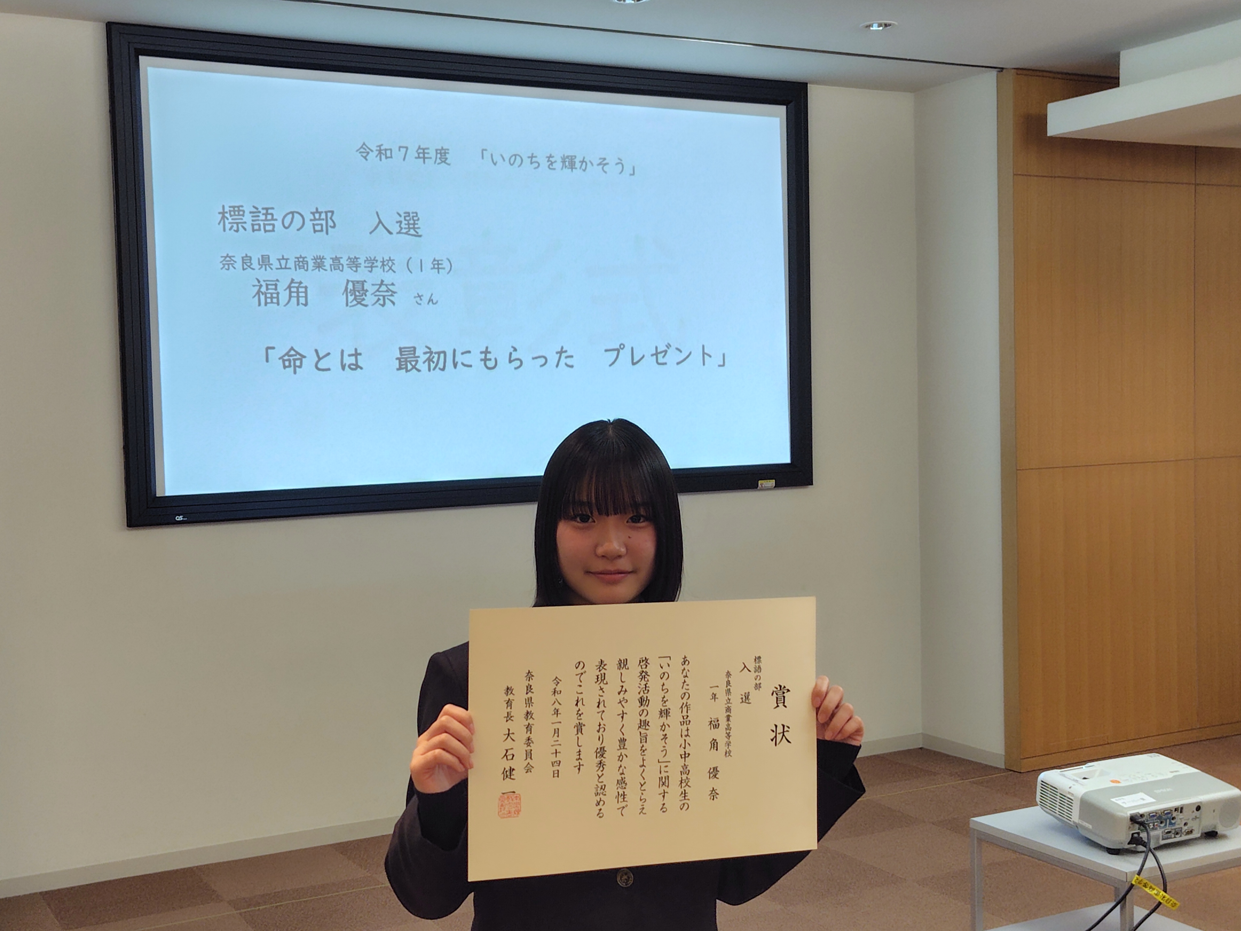 1月24日(土)に田原本青垣生涯学習センターで表彰式が行われました。本校1年生・福角優奈さんの作品「命とは 最初にもらった プレゼント」が標語の部で入選(奈良県教育長賞を受賞)し、表彰式に参加しました。