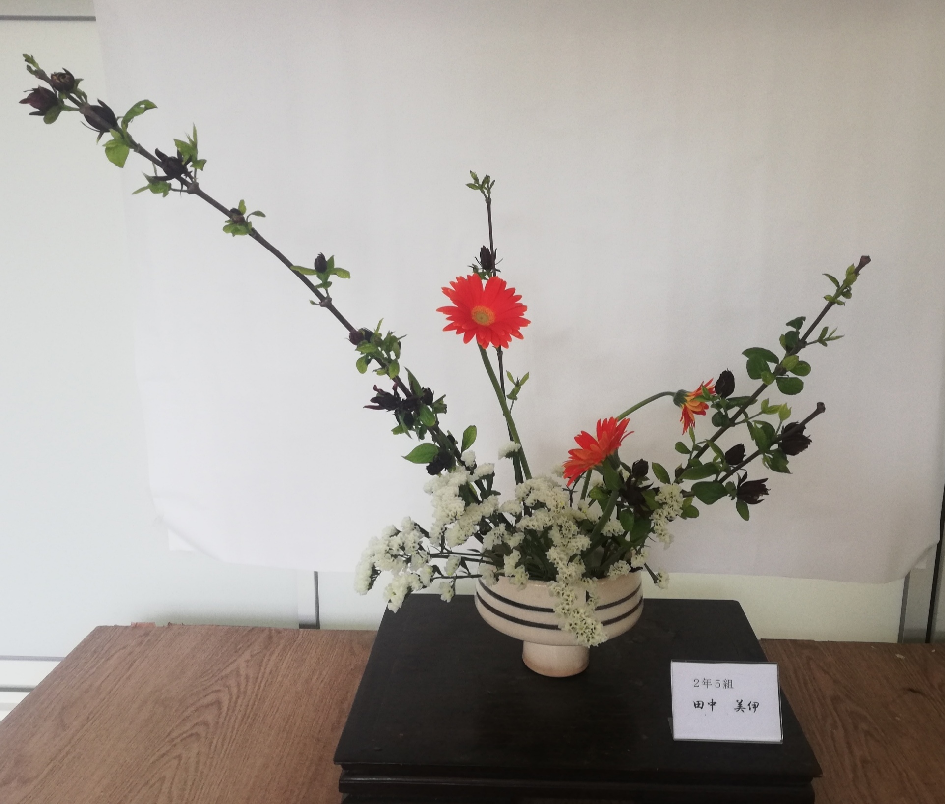 週に1回、未生流の先生の指導のもとで、一般的な盛花を中心に、アレンジフラワーや格調高いお流儀にも挑戦しながら幅広く練習しています。練習日には玄関にも生けていますが、群鳩祭では季節に応じた多種な花材を使った生け花を展示し、日ごろの練習の成果を披露しています。2年間以上続けて活動すると、お免状の申請もできます。