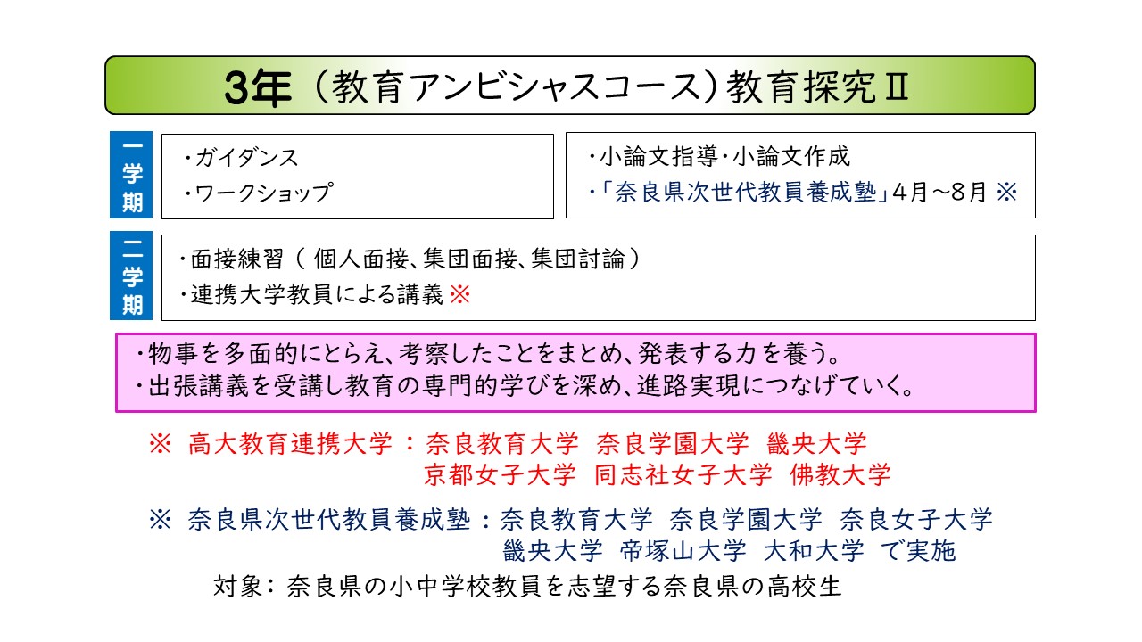 「教育探究Ⅱ」は第3学年で学校設定科目として週1時間学習します。