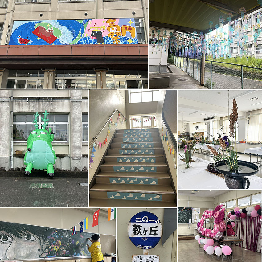 教室展示はフォトスポットに、階段装飾、中庭装飾・・・校門にはビッグなたかまどはんが登場しました。