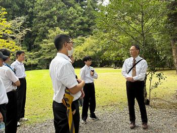令和7年9月19日(金)、1年生が総合的な探究の時間に、世界遺産である「紀伊山地の霊場と参詣道」を代表する熊野本宮大社とその周辺を散策し、日本古来の自然崇拝の文化について学びを深めました。