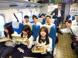 まずはビスタカーで京都まで。車内では勉強をする人の姿も。新幹線内では少し早い昼食弁当をいただきました。