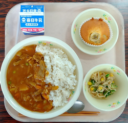 今年度最後の給食のメニューは、カレーライス、牛乳、大根サラダ、手作りカップケーキです。