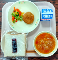 今日の給食メニューは、食パン(ブルーベリージャム)、牛乳、メンチカツ、彩りサラダ、ポークビーンズスープです。