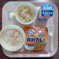 救給カレーは、災害時のために学校に備蓄しているものをローリングストック方式で一年に一度消費していくものです。カレー味のおかゆのような食感で、とびきり美味しいというほどではありません。150gなので、個人的には少し物足りないです。サラダ、フルーツでさっぱりとして安心できました。(校長・辻)