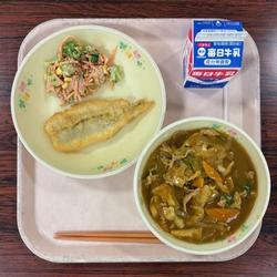 今日の給食は、カレーうどん・牛乳・かますの天ぷら・ブロッコリーのおかかマヨサラダです。