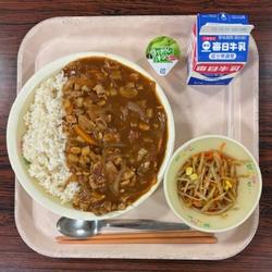 ハヤシライスはとても具だくさんで、トマトとマッシュルームの風味が印象的な一品でした。また、今日は高等部の生徒が校内放送で「10月は食品ロス削減月間です。日本では、1人当たりお茶碗半分のごはんが毎日廃棄されています。」と全校に呼びかけてくれました。みんなで食品ロス削減に努めましょう。
