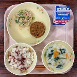 今日の給食は、梅ちりごはん・牛乳・お好み焼き・キャベツのサラダ・飛鳥汁です。関西人が大好き、いわゆる「お好み焼き定食」です。