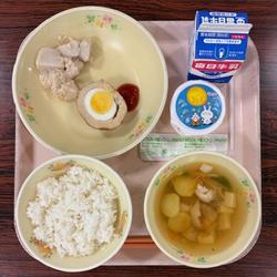 今日の給食は、ごはん・牛乳・スコッチエッグ・里芋のそぼろ煮・お月見汁・お月見ゼリーです。給食も「お月見メニュー」です。