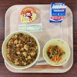 今日の給食は、麻婆丼・牛乳・いんげんの中華和え・アセロラゼリーです。