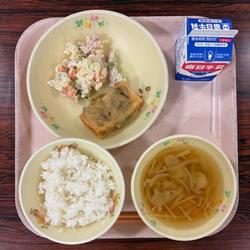 今日の給食は、ごはん・牛乳・ポテトサラダ・揚げ出し豆腐のおろしだれ・しょうがたっぷりつみれ汁です。