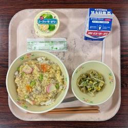 今日の給食は、他人丼・牛乳・大根サラダ・シークワーサーゼリーです。