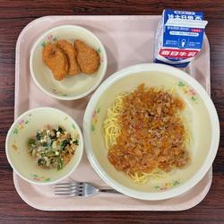 今日の給食は、ミートスパゲティ・牛乳・チキンナゲット・ほうれん草とチーズのサラダです。