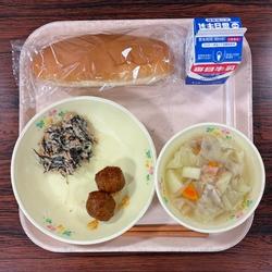 今日の給食は、味付けパン・牛乳・ミートボールのトマトソースがけ・ひじきと大豆のサラダ・野菜スープです。