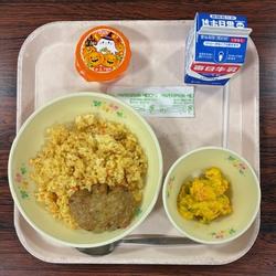 今日の給食は、カレーピラフ・牛乳・かぼちゃ型ハンバーグ・かぼちゃサラダ・かぼちゃプリンです。
