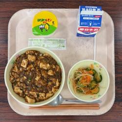 今日の給食は、麻婆丼・牛乳・きゅうりの中華サラダ・はちみつレモンゼリーです。