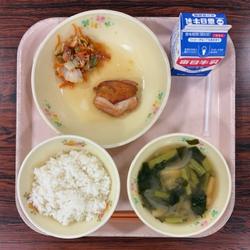 今日の給食は、ごはん・牛乳・鶏肉の照り焼き・白菜のおかか和え・じゃがいものお味噌汁です。