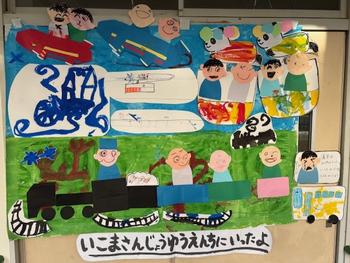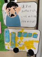 小学部の廊下に「いこまさんじょうゆうえんちにいったよ」と題する大きな作品が掲示されています。遠足の振り返り学習として描いた作品だと思われますが、楽しそうな様子が目に浮かぶように伝わってきます。その作品の一部分に、泣いている子の絵がありました。見てみると、遠足当日欠席した児童が普段から大好きなスクールバスを描いたようです。教員の児童への心遣いに感謝しつつ、「次はみんなと一緒に行けたらいいね」と願いました。