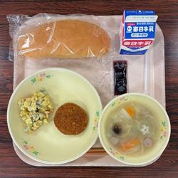 今日の給食は、味付けパン・牛乳・ブルーベリージャム・奈良のキャベツメンチカツ・さつまいものサラダ・野菜スープです。