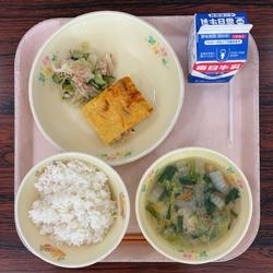今日の給食は、ごはん・牛乳・中華風オムレツ・きゅうりとツナのごま酢・白菜と肉団子のスープです。