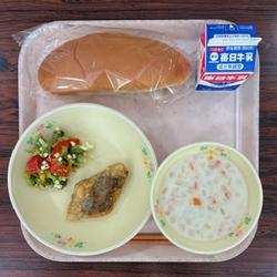 今日の給食は、味付けパン・牛乳・たらのレモン和え・ブロッコリーの彩りサラダ・クリームシチューです。