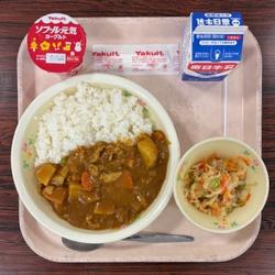 今日の給食は、ポークカレー・牛乳・キャベツのサラダ・ヨーグルトです。