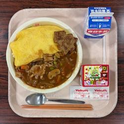 今日の給食は、オムハヤシ・牛乳・もみの木ハンバーグ・クリスマスケーキです。