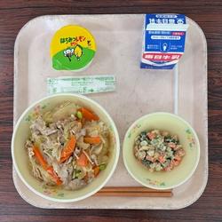 出張等が重なり、ようやく今年2食目の給食です。世に豚丼は様々なタイプがありますが、今日は「牛丼・すき焼き丼タイプ」です。具だくさんで彩りもよく、ボリューム満点の一品でした。また、写真にはありませんが、味変用に紅しょうがも添えてありました。