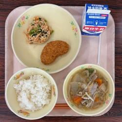 今日の給食は、ごはん・牛乳・ささみ梅しそフライ・そぼろ納豆・豚汁です。