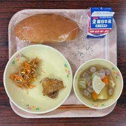 今日の給食は、味付けパン・牛乳・鶏肉のハーブ焼き・ごぼうサラダ・ポトフです。