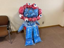 先日開催した奈良西作品展でフォトスポットの主役として大活躍してくれたミャクミャクが、この度、私の新しい「ルームメイト」として校長室に来てくれました。このミャクミャクは、小学部高学年の児童が古紙や発泡スチロール等の廃材を使って製作してくれました。