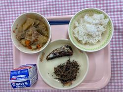 ごはん ぎゅうにゅう いわしのうめに かたひらあかねいり てづくりふりかけ にくじゃが |