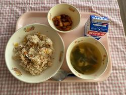 チャーハン ぎゅうにゅう いかとだいずのあまからあえ わかめスープ |